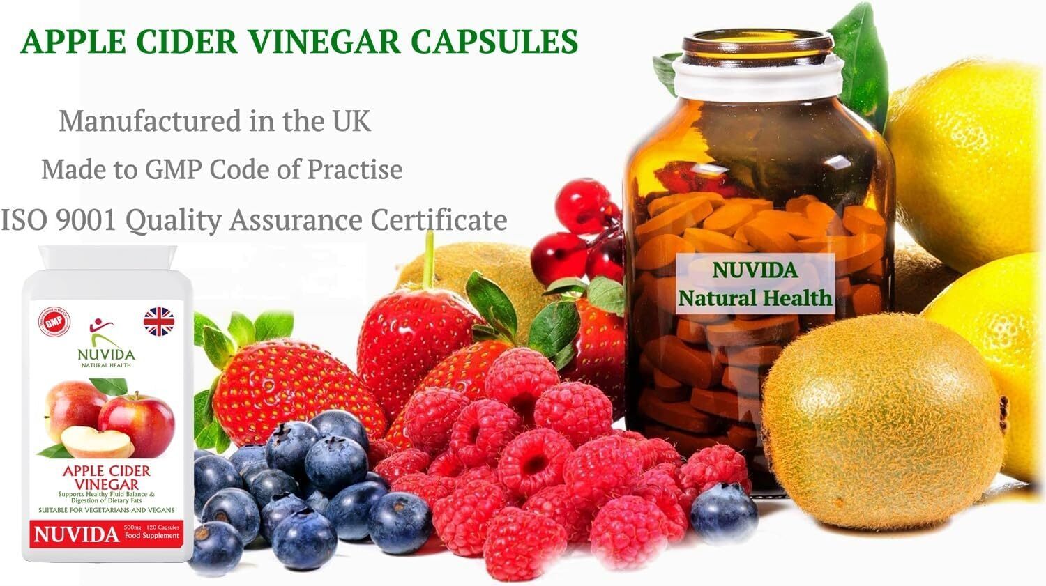 - Nuvida High Strength Apple Cider Vinegar capsules provide 500mg of premium Apple Cider Vinegar in an easy use daily supplement. Nuvida Apple Cider Vinegar capsules contain only pure Apple Cider Vinegar with no fillers or mixers.