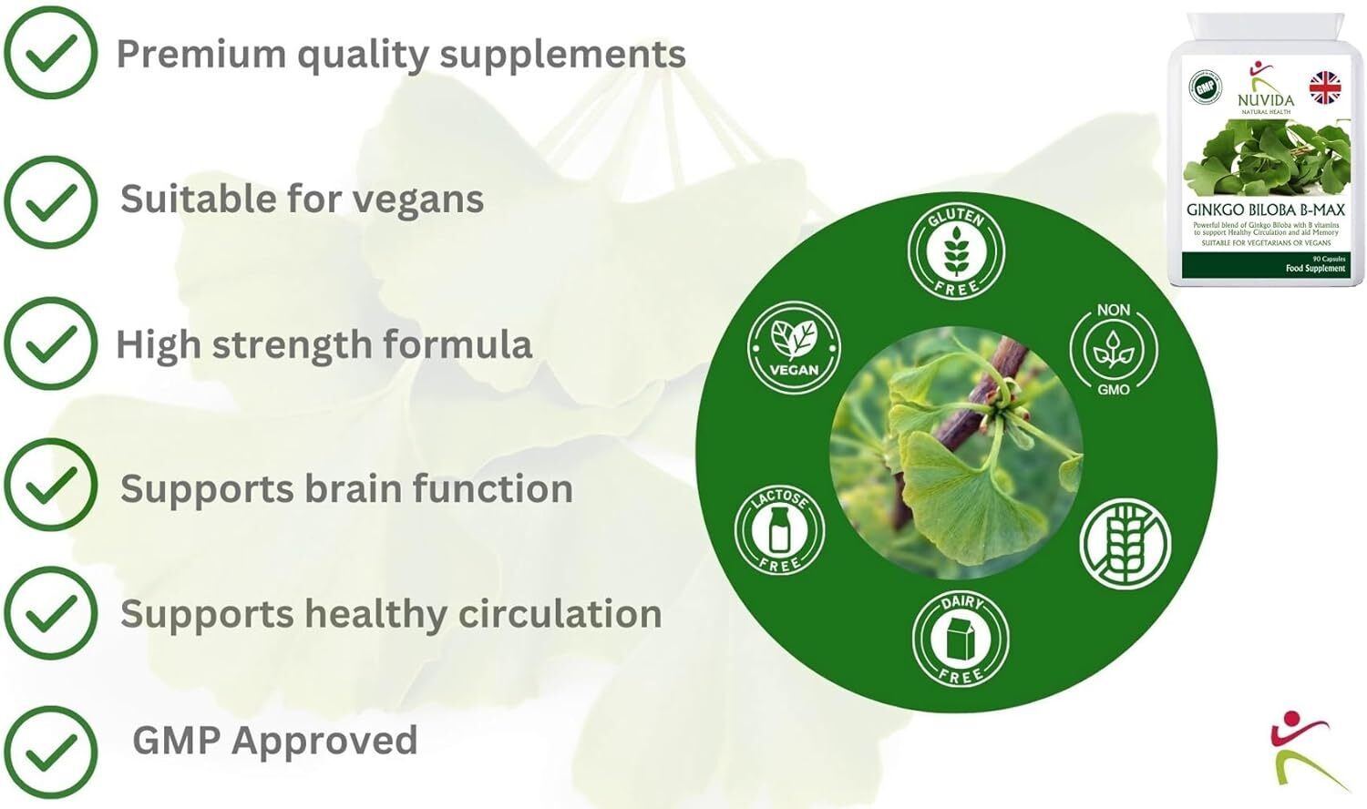 - High Strength Ginkgo Biloba 2000mg blended with Vitamin B complex including Folic Acid and Vitamin B12 to support healthy circulation and help maintain normal brain function and skin pigmentation.