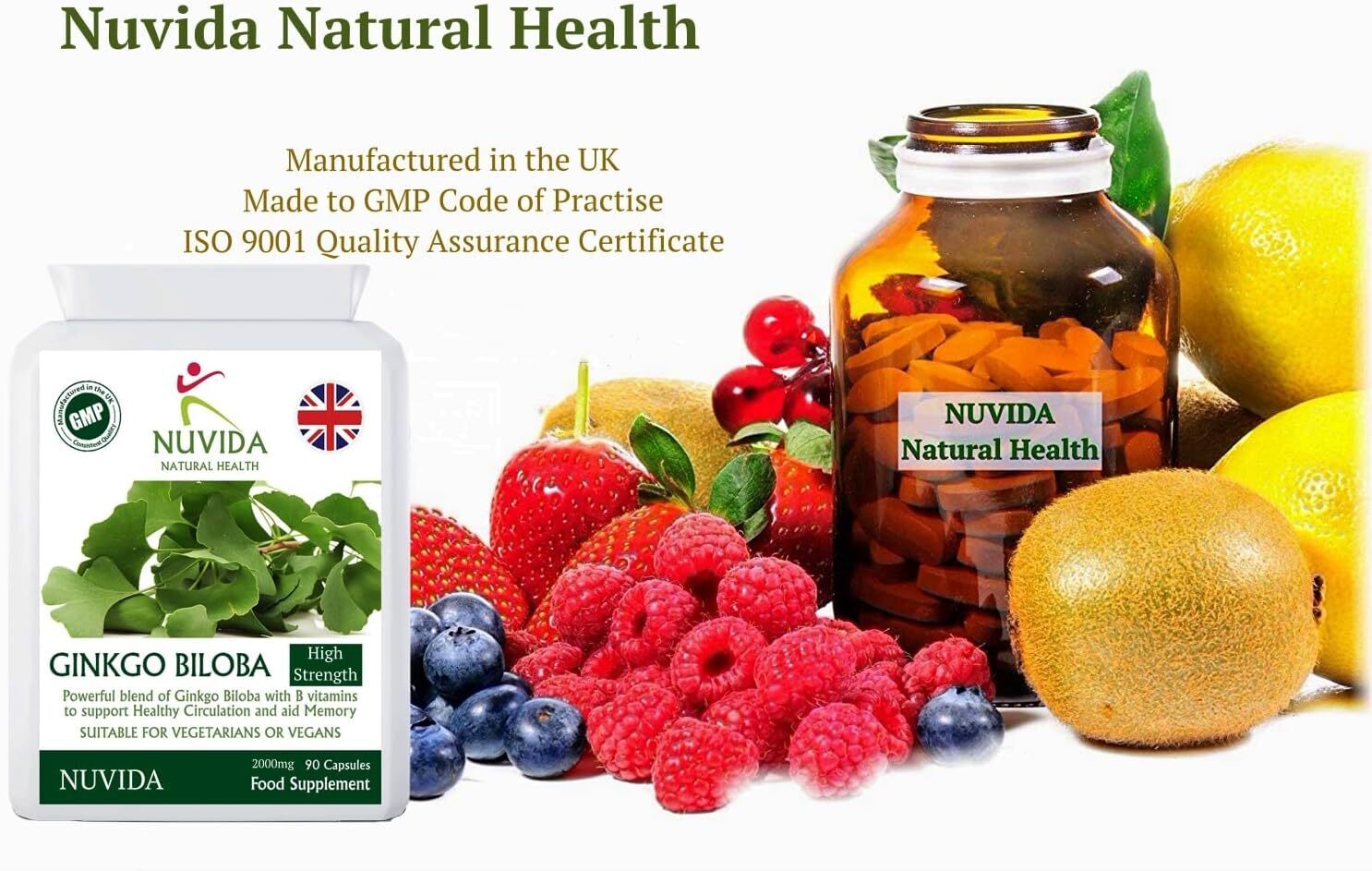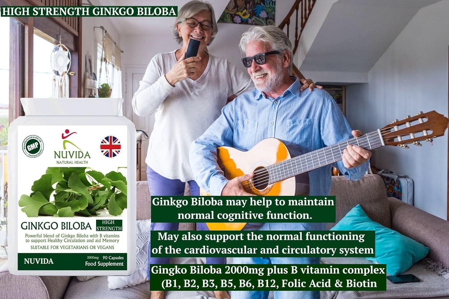 - High Strength Ginkgo Biloba 2000mg blended with added Folic Acid and Vitamin B12.